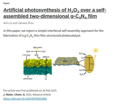 近日,德赢ac米兰官方合作vwin化学与材料工程学院2023级硕士研究生刘奥丽在国际知名期刊Journal of Materials Chemistry A(简称JMCA,影响因子10.7,JCR Q1TOP期刊)上发表题为“Artificial photosynthesis of H2O2overaself-assembledtwo-dimensional g-C3N4film”的高水平研究论文。通讯作者为我校研究生导师周建伟教授。