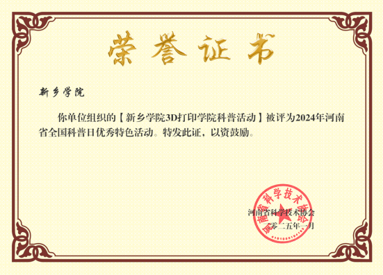 最终,我校的“3D打印学院科普活动”凭借其鲜明的特色、丰富的内容、显著的效果以及广泛的社会影响力,最终荣获2024年河南省全国科普日优秀特色活动称号。