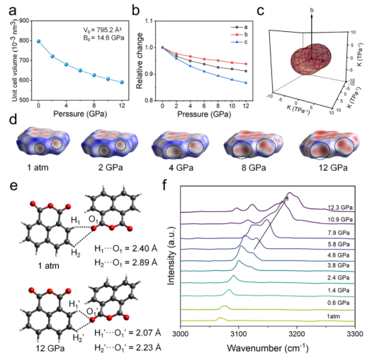 图3.(a)理论计算的萘酐晶体晶胞体积在加压过程中的演变;(b)萘酐晶体a、b和c轴的相对压缩率;(c)萘酐晶体在a、b和c轴方向上的压缩性指标;(d)不同压强下萘酐晶体中分子的Hirshfeld表面;(e)在1 atm(环境条件)和12 GPa下萘酐晶体中的氢键示意图;(f)不同压强下萘酐晶体从3000到3300 cm-1的红外吸收光谱。