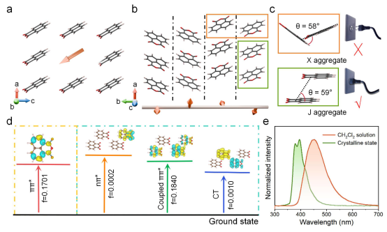 图1.(a,b)萘酐(Naphthalene Anhydride)晶体的结构示意图;(c)萘酐晶体分子堆积角度;(d)萘酐单体和四聚体中从激发态到基态的电荷差分密度图,蓝色区域表示电子密度降低,黄色区域表示电子密度增加;(e)结晶态萘酐及其在二氯甲烷溶液中的荧光发射光谱。