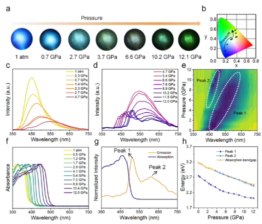 图2.(a)萘酐晶体在紫外光(λ= 355 nm)照射下的荧光照片;(b)不同压强下萘酐晶体荧光发射的色位坐标图;(c、d)不同压强下萘酐晶体的荧光光谱;(e)不同压强下萘酐晶体的归一化二维伪彩色荧光发射图;(f)不同压强下萘酐晶体的吸收光谱;(g)12.0 GPa下的萘酐晶体吸收和发射光谱;(h)峰1和峰2的发射能及吸收带隙。