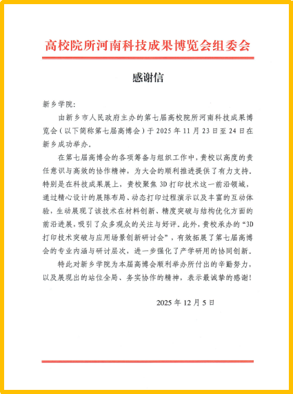 我校高度重视本次高博会,在展会与平行论坛筹备和举办期间,校领导与科研处领导具体指挥调度,多次亲临指导,把握细节,3D打印学院组织专项工作组,一方面精心布展,最大限度展现我校特色亮点;一方面积极邀请专家,高规格筹办平行论坛,终于使得两项活动均取得圆满成功。此次收到组委会专项感谢信,是对我校在科技创新、学科建设、产教融合及社会服务等方面工作的高度认可与充分肯定。我校将以此为激励,持续深耕3D 打印等优势领域,不断深化校企校地协同创新,加强科研成果转化与应用,积极发挥高校服务区域经济社会发展的职能作用,为推动相关产业高质量发展、助力河南“两高四着力”建设作出新的更大贡献。