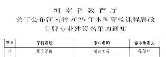近日,河南省教育厅公布了2025年河南省本科高校课程思政品牌专业建设名单,我校制药工程专业凭借扎实的建设基础、鲜明的思政特色和突出的育人成效成功入选,标志着该专业在课程思政建设与专业教育深度融合方面迈上新台阶,成为学校落实立德树人根本任务、推动教育教学改革的重要成果。