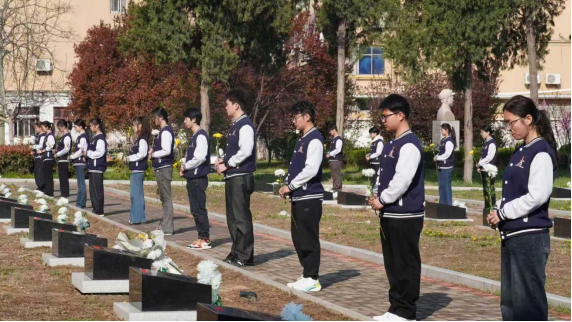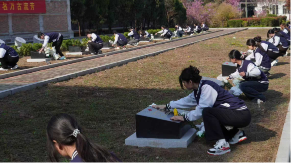 仪式结束后,师生们怀着无比崇敬的心情,轻轻擦拭烈士墓碑,仔细清除碑身灰尘,并将手中的鲜花郑重敬献在烈士墓碑前。大家缓步绕行,瞻仰英烈,低声诉说对英烈的思念与敬意,在肃穆的氛围中感悟英烈精神的力量。