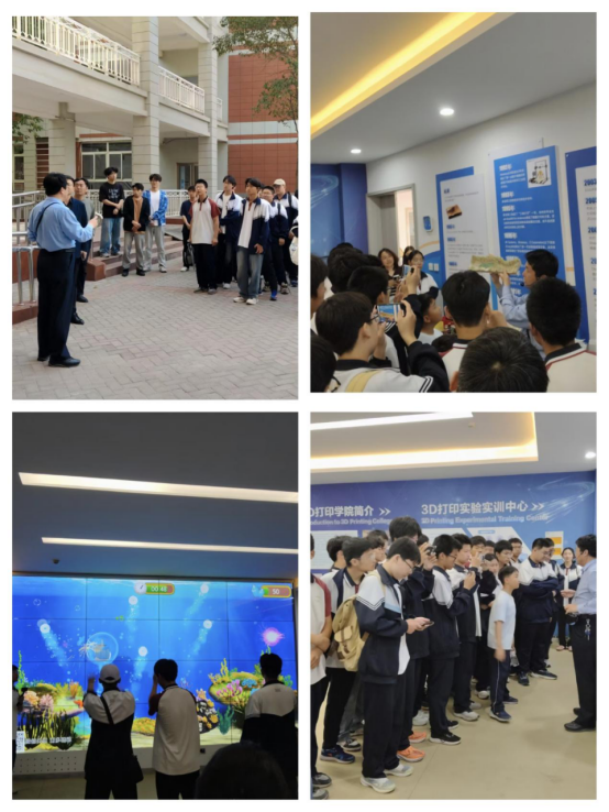 首先在3D打印学院实验实训中心为济源四中师生开展了沉浸式3D打印认知体验活动。田文强带队讲解,志愿者辅助引导,分别体验参观体验了3D数据中心、树脂打印实验室、3D前后处理实验室、尼龙打印实验室、金属打印实验室、逆向工程实验室、激光内雕实验室、FDM桌面打印实验室(3D工作坊)。尤其是在最后一站FDM桌面打印实验室(3D工作坊),志愿者指导学员代表亲手操作打印机,设置程序命令,成功打印了多个作品。在此过程中,3D数据中心开展的人机互动环节将研学培训活动一次又一次推向高潮。