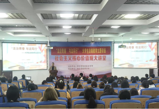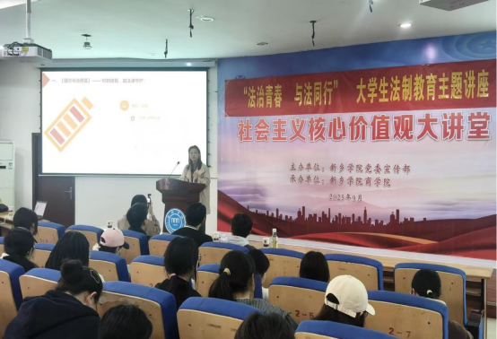 为深入贯彻《中华人民共和国法治宣传教育法》,健全“校所协同、以案释法”的公益普法机制,纵深推进商学院“1+1+1+N”新生入学教育,10月21日下午,商学院在A05报告厅举办“法治青春 与法同行”大学生法治教育主题讲座。北京京师(新乡)律师事务所合规法律事务部主任胡慧雯受邀授课,商学院副院长李蛟与200余名学生代表参加了讲座。