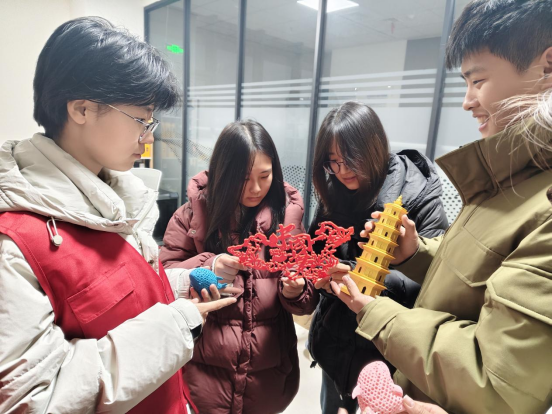 活动现场,讲解员杨雨菲、张晓佳、王奔、秦子涵携带3D打印技术制作的红旗渠模型、井冈山号角、上海一大旧址模型等红色文创产品亮相展台,立即获得与会人员的高度关注。同学们以生动细致的讲解,向现场群众讲述红色故事,普及3D打印知识,让大家在直观感受科技魅力的同时,重温革命历史、汲取精神力量。
