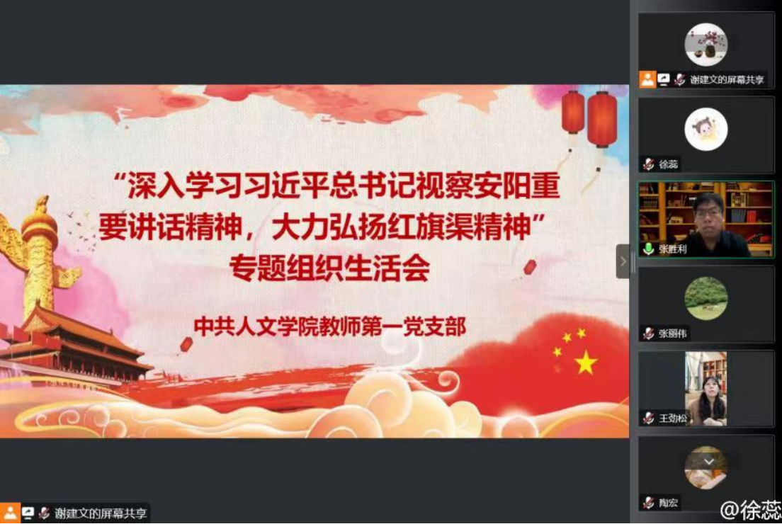 为深入学习贯彻党的二十大精神和习近平总书记视察安阳重要讲话精神,深刻领会红旗渠精神的丰富内涵和时代价值,人文学院教师第一、第二党支部,学生第一、第二、第三、第四党支部,于11月17日-22日,通过线上会议形式陆续召开了“深入学习习近平总书记视察安阳重要讲话精神,大力弘扬红旗渠精神”专题组织生活会。校党委副书记杨士斌、副校长张丽伟以普通党员身份参加此次会议。
