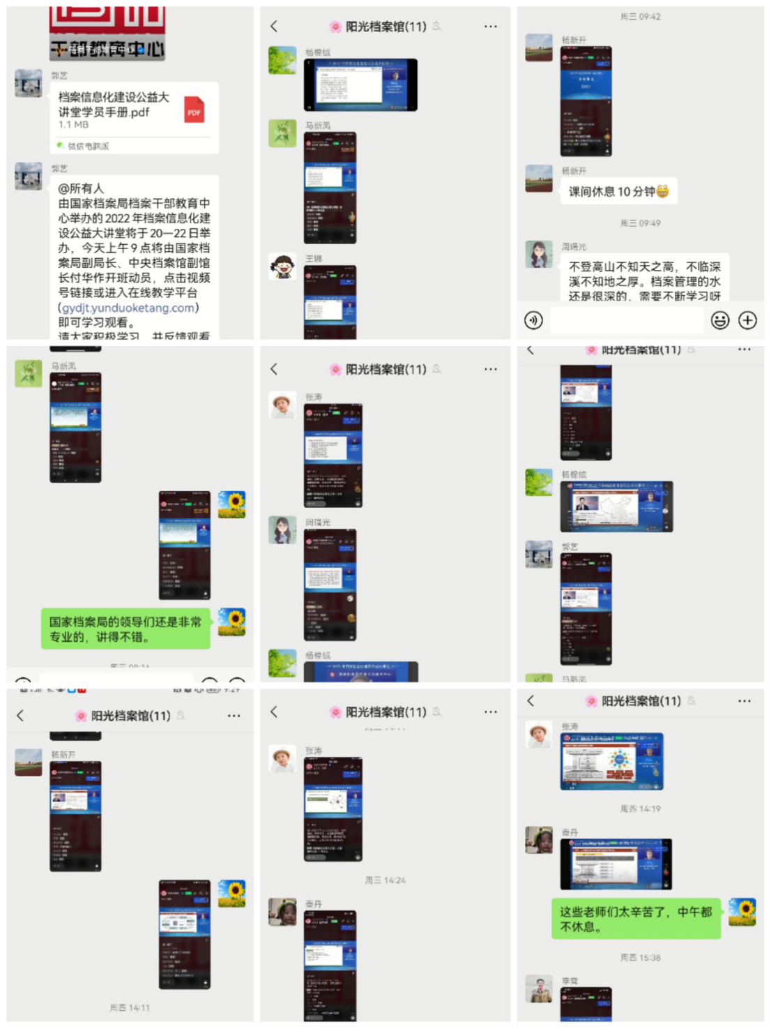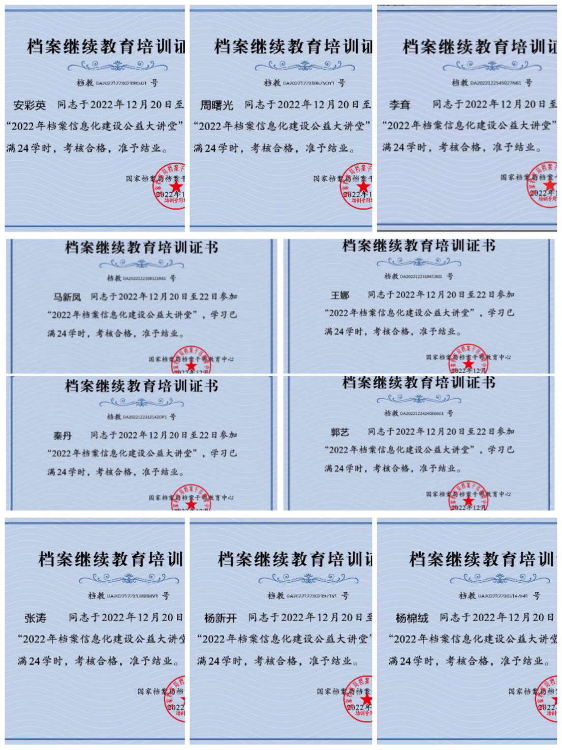 档案馆通过国家档案局了解到讲座培训信息后认为这是一次提升档案工作现代化水平、提高档案馆人员思想理论修养、加强档案工作素养的大好时机,立即发布通知组织动员全体人员在线学习。在工作群里转发了“档案信息化建设公益大讲堂学员手册”,指导大家了解学习内容,掌握在线注册、报名、收看讲座的方法。虽然当前疫情防控形势严峻,档案馆人员大多感染新冠病毒,处于居家隔离状态,但是大家克服身体上的不适,通过手机、电脑等积极参加在线学习培训。这次讲座规格高:由国家档案局副局长、中央档案馆副馆长付华作开班动员,邀请国家档案局领导、国家电子文件管理主管部门、国家档案局业务指导部门和地方档案部门以及高校从事档案信息化研究的专家学者担任主讲。讲座内容丰富,节奏紧凑:20日至22日,三天内每天上午九点到十一点半、下午两点到四点半,围绕“深入学习贯彻党的二十大精神,努力提高档案工作现代化水平”“数字时代背景下的国家电子文件管理发展战略”“电子档案长期保存的几个问题”“档案赋能数字政府与数字经济”“政务服务事项电子档案管理难点问题及应对之策”“新一代信息技术在档案工作中的应用”等六个方面专题对新时期档案工作进行了全方位的解读和宣讲。其中,对贯彻习近平总书记对档案工作重要批示的学习辅导,对二十大报告精神的重点解读,以及数字背景下档案工作、档案信息化工作的新探索,彰显了档案事业发展坚持党的领导、坚持人民立场、坚持依法治档、坚持改革创新、坚持安全底线的原则。经过两天时间的集中学习,大家吸收着档案前沿知识,感受着档案工作的荣光与责任。认真收看、仔细聆听、用心体会,讲座之后积极参加在线考试,并且以优异的成绩全部通过了培训考试,取得了培训结业证书。