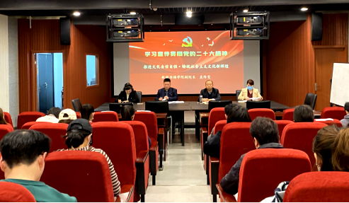 为深入学习宣传贯彻党的二十大精神,新闻传播学院党委陆续开展了党的二十大精神系列宣讲活动。3月28日下午,新闻传播学院副院长聂绛雯作了题为《推进文化自信自强,铸就社会主义文化新辉煌》的宣讲报告,全体教职工参加会议,报告会由学院党委书记王卫锋主持。