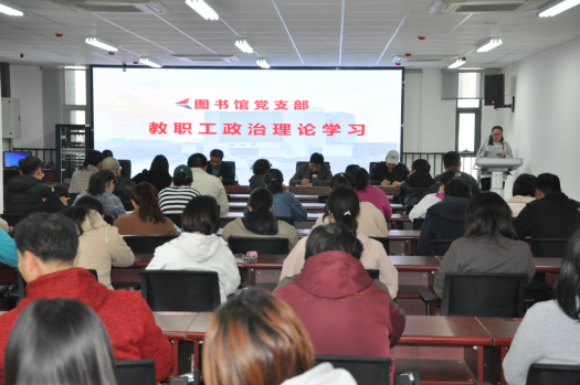 3月28日下午,图书馆党支部举行全体教职工会议,专题传达学习党的二十届二中全会精神。会议由党支部书记白涛主持。