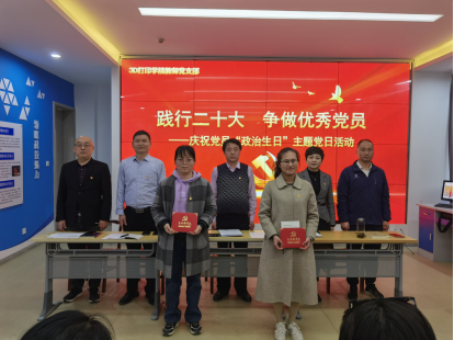 为进一步丰富党内政治生活,增强支部党员理想信念,深入学习贯彻党的二十大精神,进一步强化党员政治意识,增强政治认同感,近日,3D打印学院教师党支部组织开展了“践行二十大 争做优秀党员 共过政治生日 重温入党初心”主题党日活动。