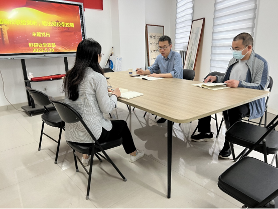 为扎实推进习近平新时代中国特色社会主义思想主题教育,为党的生日献礼,在“七一”建党节来临之际,根据机关党委《中共德赢ac米兰官方合作vwin机关委员会关于开展“唱响校歌给党听,唱出爱校荣校情”校歌大传唱系列活动的通知》要求,科研处党支部于5月30日下午在图书馆819室开展“唱响校歌给党听,唱出爱校荣校情”主题党日。主题党日由科研处党支部书记赵磊主持。